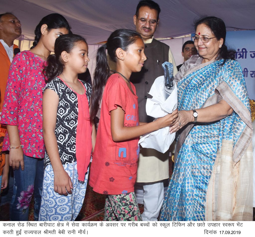 प्रधानमन्त्री मोदी के जन्मदिन पर आयोजित सेवा कार्यक्रम में राज्यपाल बेबी रानी मौर्य ने गरीब बच्चों को बांटे उपहार