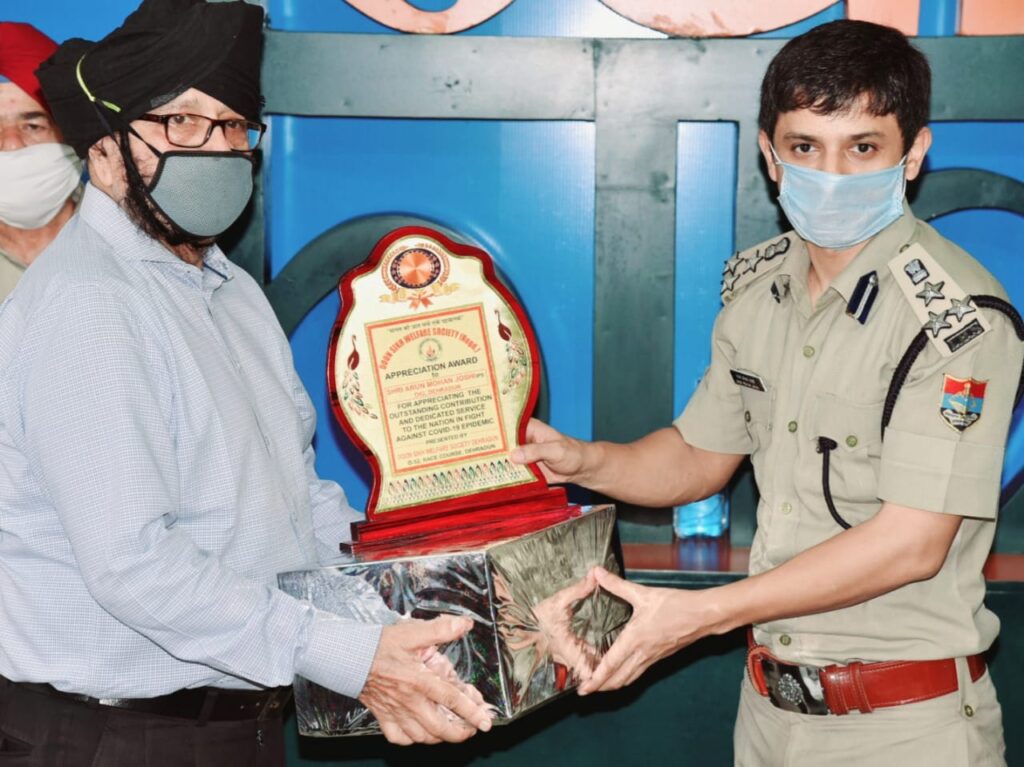 देहरादून। दून सिख वैलफेयर सोसाइटी ने लाॅक डाउन के दौरान दून पुलिस के अमूल्य योगदान के लिए सम्मान समारोह आयोजित किया। कुशल नेतृत्व से कोरोना संकट के दौरान दून पुलिस का मार्गदर्शन करने पर डीआईजी अरुण मोहन जोशी को स्मृति चिन्ह प्रदान किया गया। साथ ही के सभी राजपत्रित अधिकारियों को भी कोरोना वारियर के रूप में सम्मानित किया गया।