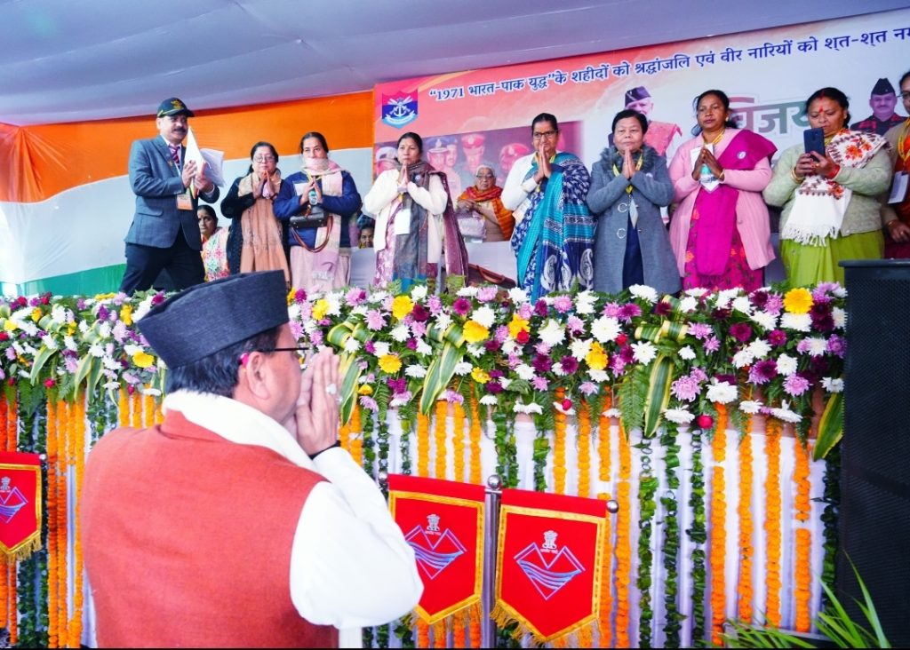 मुख्यमंत्री ने कहा कि वीर जवानों ने अदम्य साहस और सर्वोच्च बलिदान से 1971 के युद्ध में राष्ट्र की अखंडता और स्वाभिमान की रक्षा की। आज भारतीय सेना के शौर्य, त्याग और अटूट राष्ट्रनिष्ठा की गौरवगाथा को स्मरण करने का दिन है, जो हमारे इतिहास के पन्नों पर स्वर्णाक्षरों में अंकित है। कहा कि 1971 में पाकिस्तान के लगभग 93 हजार सैनिकों ने हमारी सेना के समक्ष आत्मसमर्पण किया। इस युद्ध में वीरभूमि उत्तराखंड के 248 बहादुर सपूतों ने भी अपना सर्वोच्च बलिदान दिया। हमारे प्रदेश के 74 सैनिकों को अपने अदम्य साहस और शौर्य के लिए विभिन्न वीरता पदकों से सम्मानित भी किया गया था।