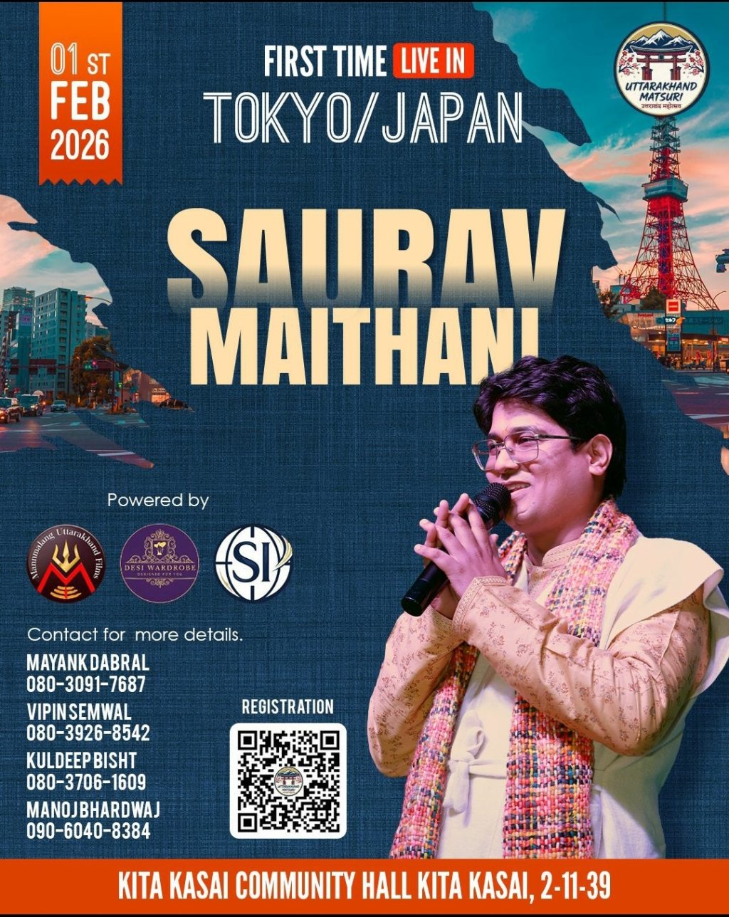 कार्यक्रम में उत्तराखंड की संस्कृति, सभ्यता, पारंपरिक पहाड़ी व्यंजन, लोकगीत एवं लोकनृत्यों की जीवंत झलक देखने को मिलेगी। ढोल-दमाऊ की थाप, लोकगीतों की मिठास और पारंपरिक वेशभूषा में सौरव मैठाणी उत्तराखंड की आत्मा को टोक्यो की धरती पर प्रस्तुत करेंगे।