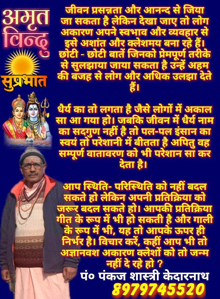 आध्यात्मिक उत्तराखण्ड धर्म शुभ प्रभात … सुविचार February 25, 2023 admin Tags: शुभ प्रभात, सुविचार Continue Reading Previous कुमार विश्वास को कालनेमि कहें या गिरगिट…Next आज का राशिफल: पं. राजेन्द्र प्रसाद जी (पंकज शास्त्री) केदारनाथ, देवभूमि उत्तराखण्ड, हिमालय More Stories उत्तराखण्ड देहरादून गोडसे को पूजने वालों से गांधी के सम्मान की उम्मीद बेईमानी: डॉ जसविंदर गोगी December 18, 2025 Shabdradh उत्तराखण्ड देहरादून राजकाज मुख्यमंत्री ने विजय दिवस पर शहीद स्मारक में पुष्पचक्र अर्पित कर वीर बलिदानियों को दी श्रद्धांजलि December 17, 2025 Shabdradh उत्तराखण्ड देहरादून शिक्षा डीएवी में खेलकूद व एनसीसी में उत्कृष्ट प्रदर्शन करने वाले छात्र-छात्राओं का किया सम्मान December 17, 2025 Shabdradh Leave a Reply Cancel replyYour email address will not be published. Required fields are marked *Comment * Name * Email * Website Save my name, email, and website in this browser for the next time I comment.