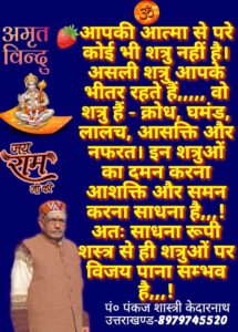आध्यात्मिक उत्तराखण्ड धर्म आत्मा से परे कोई भी शत्रु नहीं, असली शत्रु आपके अंदर April 18, 2023 Shabdradh Tags: अमृत बिंदु, शुभ प्रभात Continue Reading Previous पौड़ी गढ़वाल के 25 गांवों में लगा कर्फ्यू, धारा 144 भी लागूNext आज का राशिफल: पं. राजेन्द्र प्रसाद (पंकज शास्त्री) केदारनाथ (देवभूमि उत्तराखण्ड) हिमालय More Stories उत्तराखण्ड देहरादून राजकाज मुख्यमंत्री ने विजय दिवस पर शहीद स्मारक में पुष्पचक्र अर्पित कर वीर बलिदानियों को दी श्रद्धांजलि December 17, 2025 Shabdradh उत्तराखण्ड देहरादून शिक्षा डीएवी में खेलकूद व एनसीसी में उत्कृष्ट प्रदर्शन करने वाले छात्र-छात्राओं का किया सम्मान December 17, 2025 Shabdradh उत्तराखण्ड देहरादून कवि सम्मेलन : वंदे मातरम् के तहत बहेगी काव्य की रसधार December 14, 2025 Shabdradh Leave a Reply Cancel replyYour email address will not be published. Required fields are marked *Comment * Name * Email * Website Save my name, email, and website in this browser for the next time I comment.